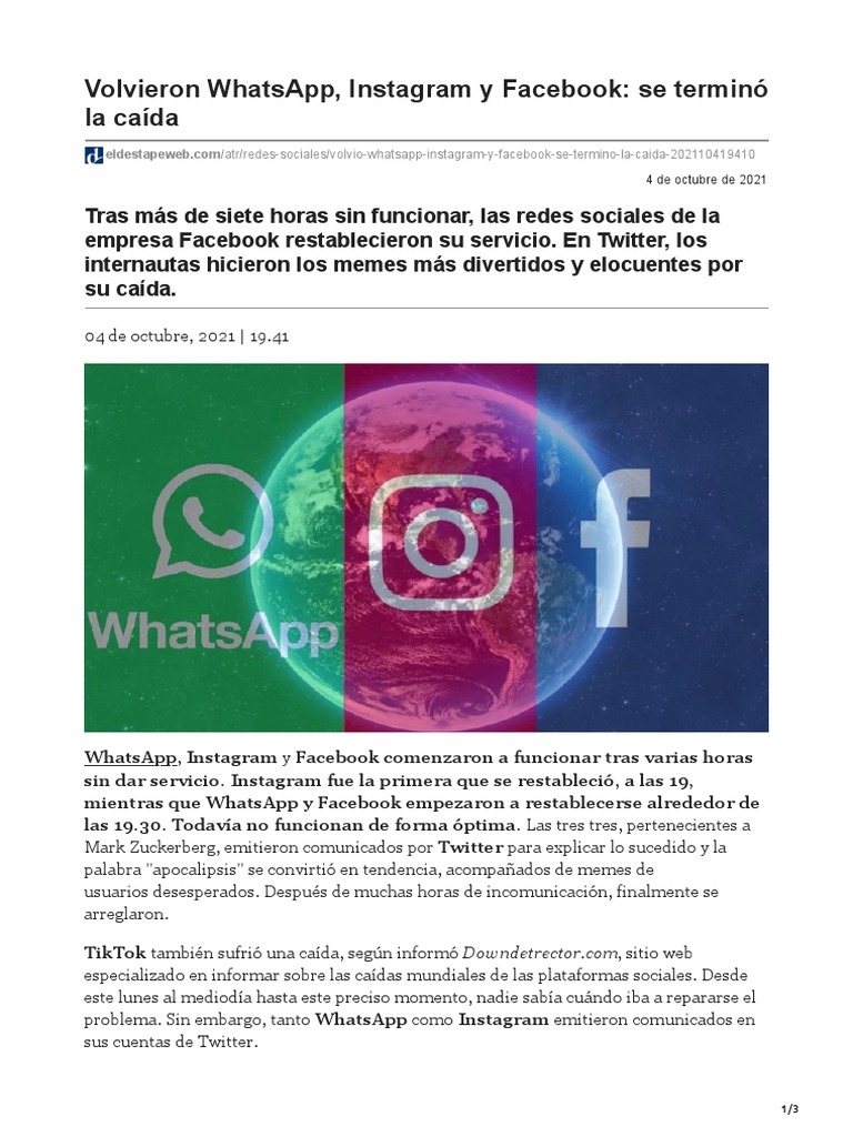 In such web page we also provide variety of graphics available. 05102021 - 0922 cot Este 4 de octubre las tres redes sociales WhatApp Facebook e Instagram que pertenecen al conglomerado económico de Mark Zuckerberg se cayeron por mÔs de 6. 29012021 2021 serÔ un año de recuperación económica gracias al rÔpido despliegue de los programas de vacunación.