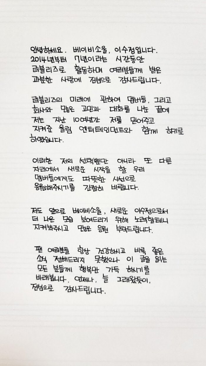 걸그룹 러블리즈 중 7인이 울림엔터테인먼트와 계약 만료를 앞둔 가운데 손편지로 해체 심경을 전했다. 그룹 러블리즈 류수정이 그룹 해체에 아쉬운 심경을 드러냈다. 데뷔 7년 러블리즈 소속사와 계약 만료손편지로 해체 심경.